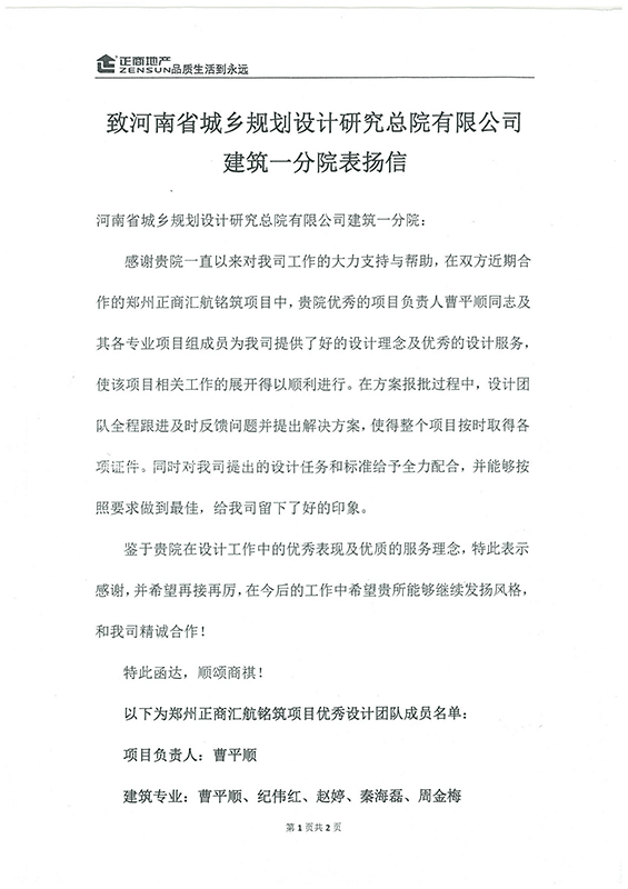 正商地產(chǎn)致河南省城鄉(xiāng)規(guī)劃設(shè)計(jì)研究總院有限公司 建筑一分院表?yè)P(yáng)信