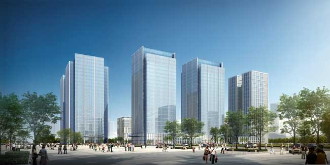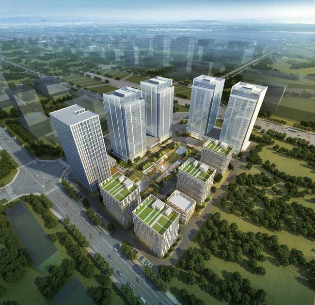 根據(jù)場(chǎng)地特征及與周圍道路的關(guān)系特點(diǎn),主樓布置于基地內(nèi)周邊??紤]到城市主干道上的城市形象,沿航海東路與經(jīng)開(kāi)第九大街布置高100m的高層辦公樓。場(chǎng)地內(nèi)部偏東南側(cè)布置四棟9層辦公樓,與沿街高層辦公形成了良好的內(nèi)部空間感受,并對(duì)高層辦公提供了良好的視野。整個(gè)場(chǎng)地為開(kāi)放式廣場(chǎng)設(shè)計(jì),與經(jīng)開(kāi)區(qū)城市中心廣場(chǎng)形成了良好空間互動(dòng)。人由城市開(kāi)放空間經(jīng)入口開(kāi)放式廣場(chǎng)進(jìn)入內(nèi)部下沉式景觀廣場(chǎng),形成在水平方向上既連續(xù)又不同的良好空間感受。場(chǎng)地內(nèi)部由屋頂綠化至自然地面再到下沉庭院,在豎直方向上的給人不同空間院落感受。